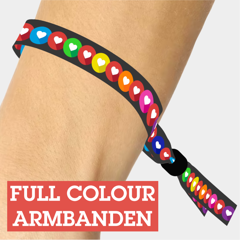 Doordat er gebruikgemaakt wordt van sublimatietechniek kunnen kleurverlopen worden gedrukt op de polsbandjes. Dit betekent dat er geen meerprijs per kleur komt en alle kleuren te drukken zijn. Hierbij kan u zelfs denken aan foto’s, uitgebreide ontwerpen of een kleurencirkel.